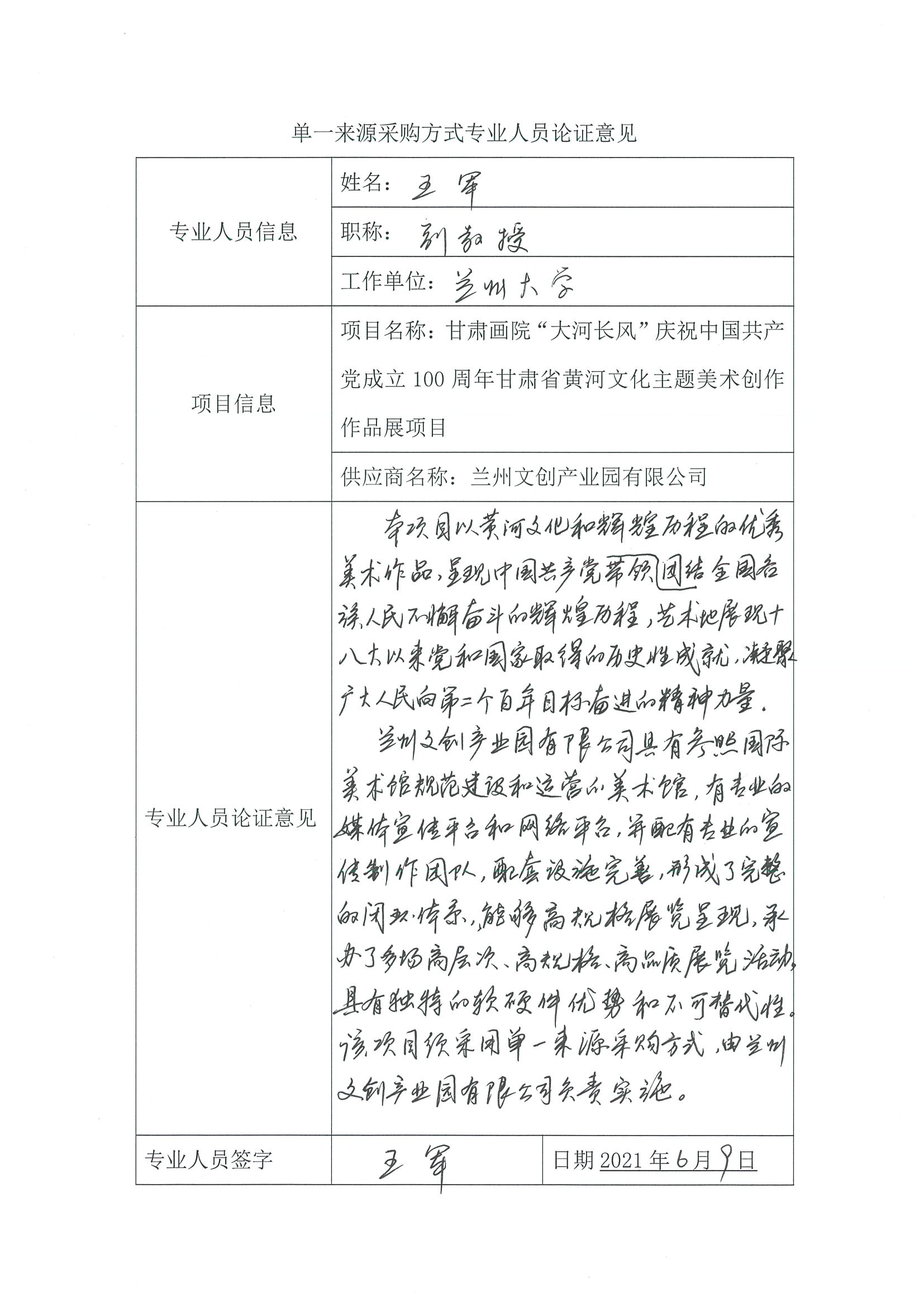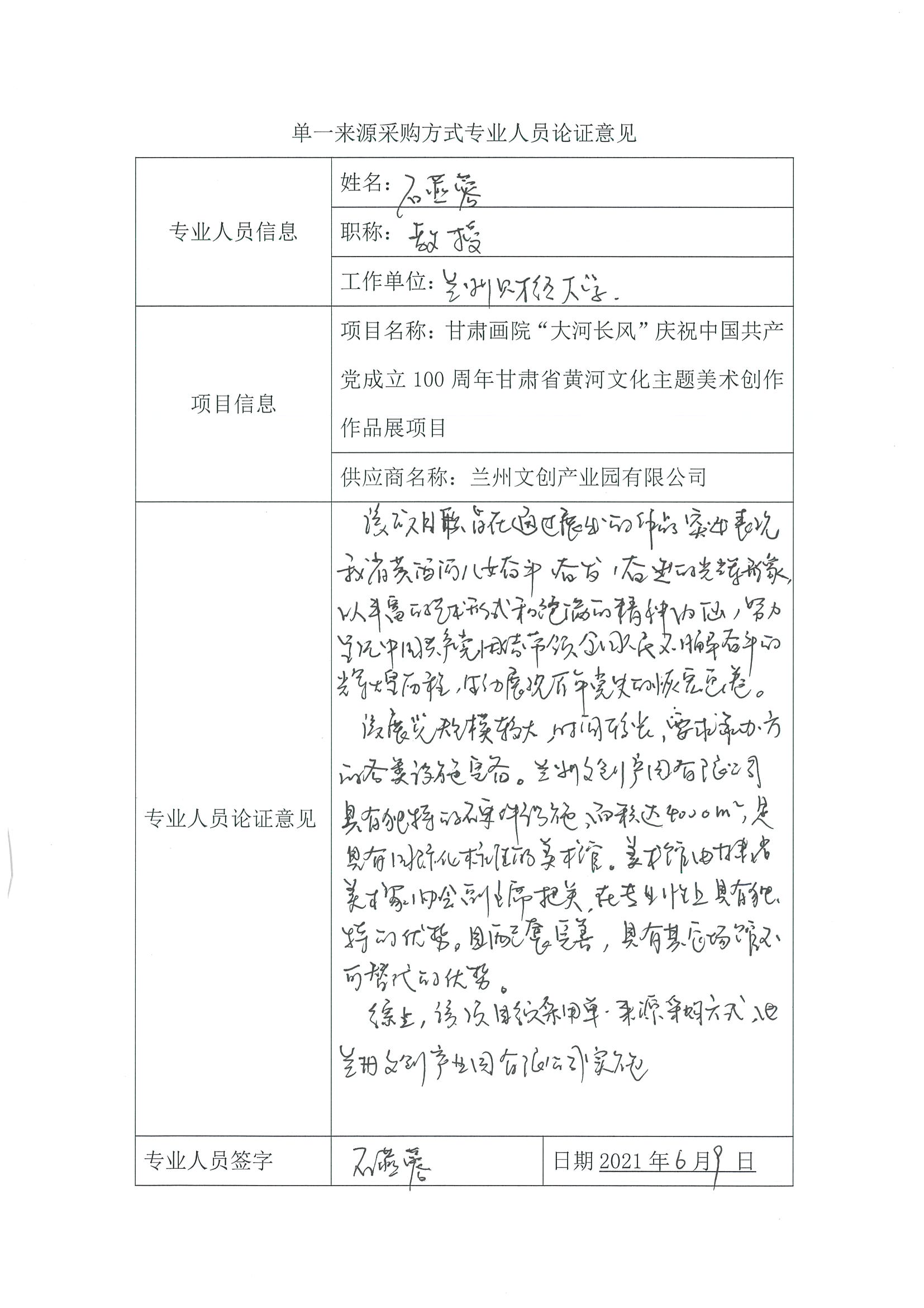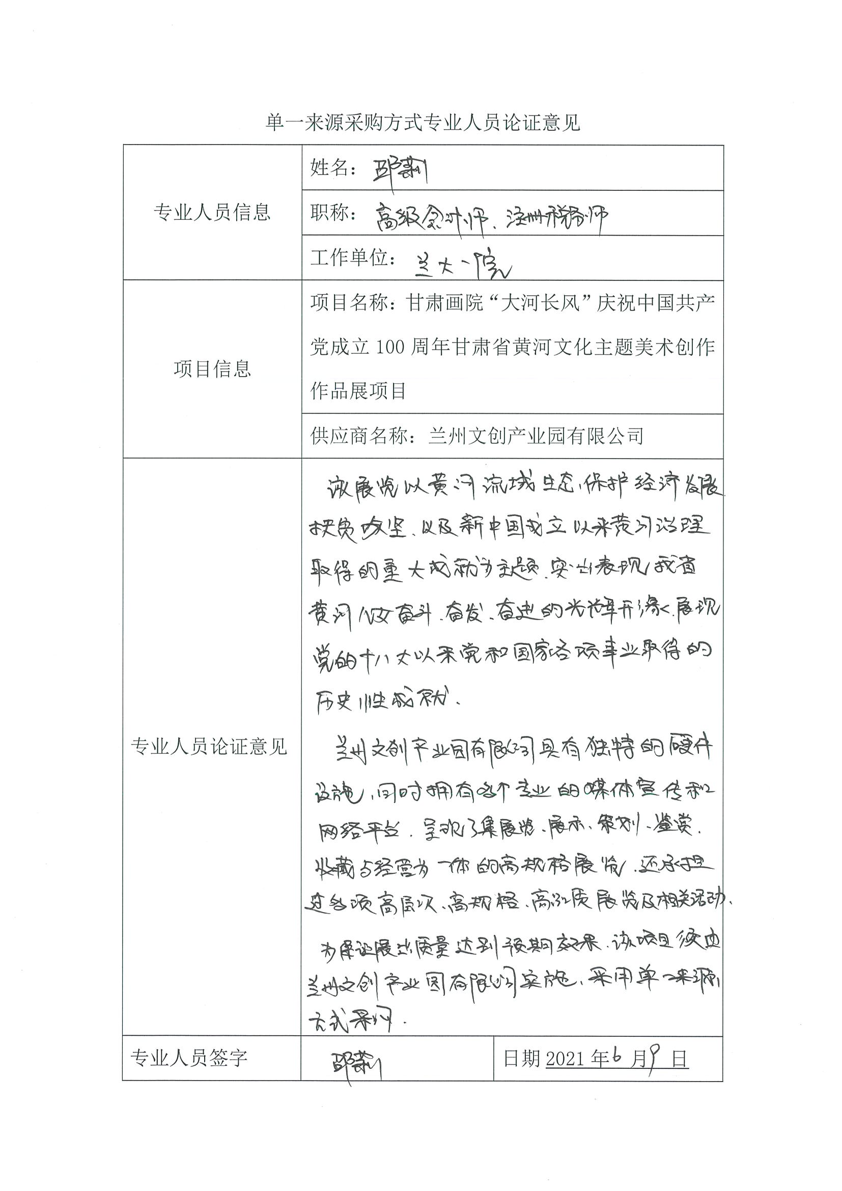 采用單一來源采購方式的原因及說明:該項(xiàng)目只能通過展出的作品突出表現(xiàn)我省黃河兒女奮斗、奮發(fā)、奮進(jìn)的光輝形象,以豐富的藝術(shù)形式和飽滿的精神內(nèi)涵,努力呈現(xiàn)中國共產(chǎn)黨團(tuán)結(jié)帶領(lǐng)全國人民不懈奮斗的輝煌歷程生動(dòng)展現(xiàn)百年黨史的恢弘畫卷。該展覽規(guī)模較大,時(shí)間較長,要求承辦方的各類實(shí)施完備。蘭州文創(chuàng)產(chǎn)業(yè)園有限公司具有獨(dú)特的硬件設(shè)施,面積達(dá)4000㎡,是具有國際化標(biāo)準(zhǔn)的美術(shù)館。美術(shù)館由甘肅省美術(shù)家協(xié)會(huì)副主席把關(guān),在專業(yè)性上具有獨(dú)特的優(yōu)勢(shì),且配套完善,具有其它場(chǎng)館不可替代的優(yōu)勢(shì)。綜上,該項(xiàng)目須采用單一來源采購方式,由蘭州文創(chuàng)產(chǎn)業(yè)園有限公司實(shí)施。